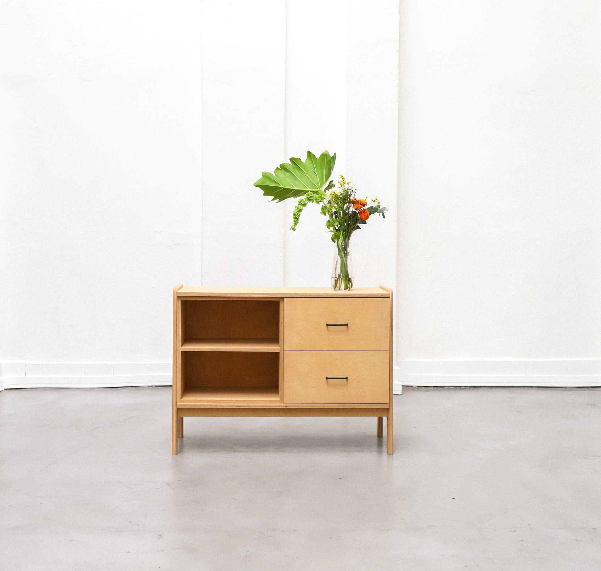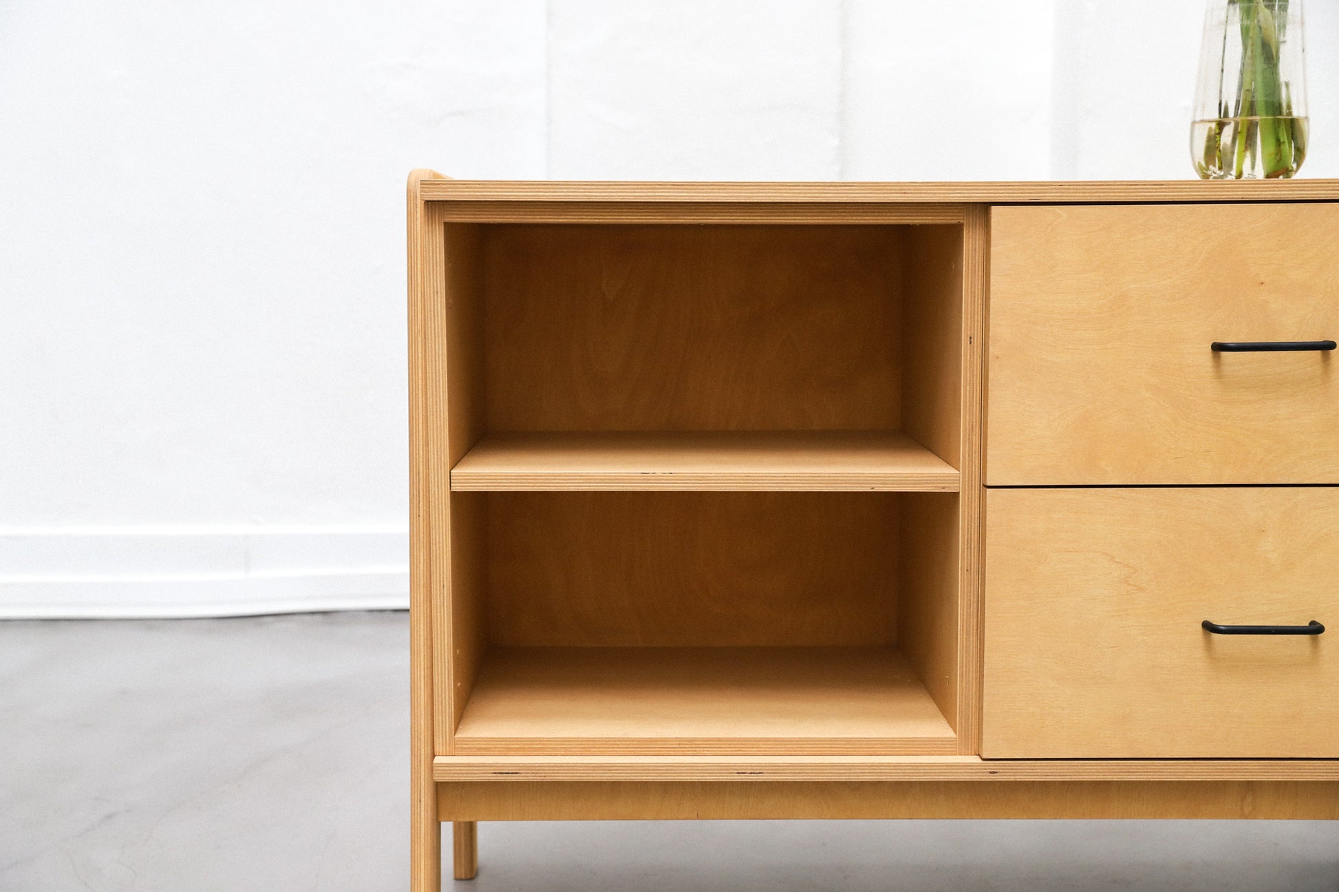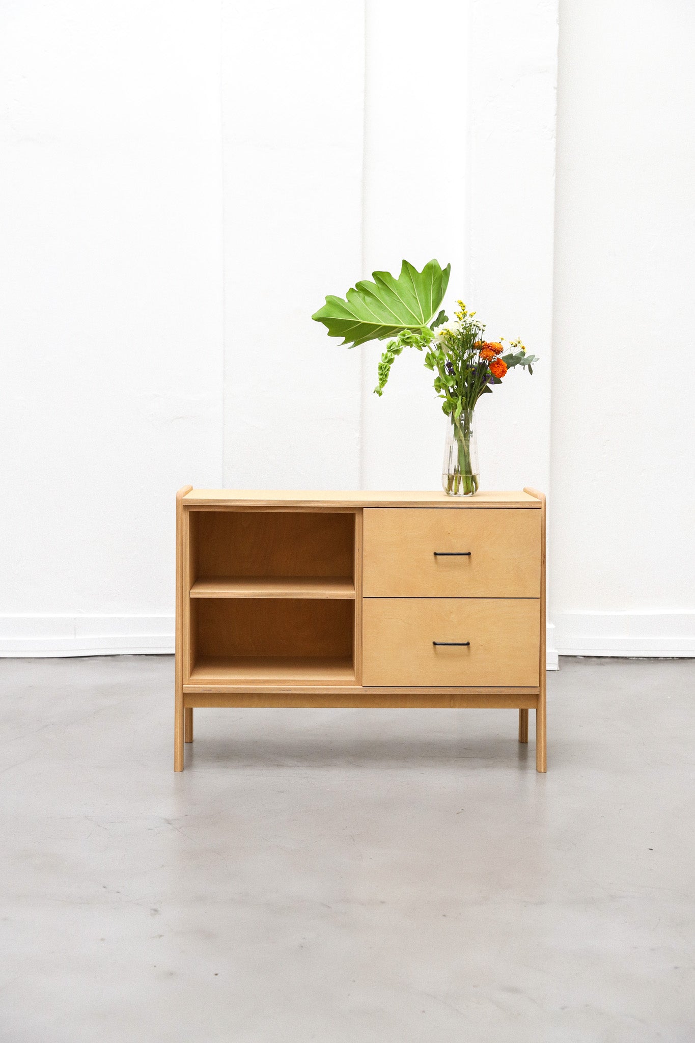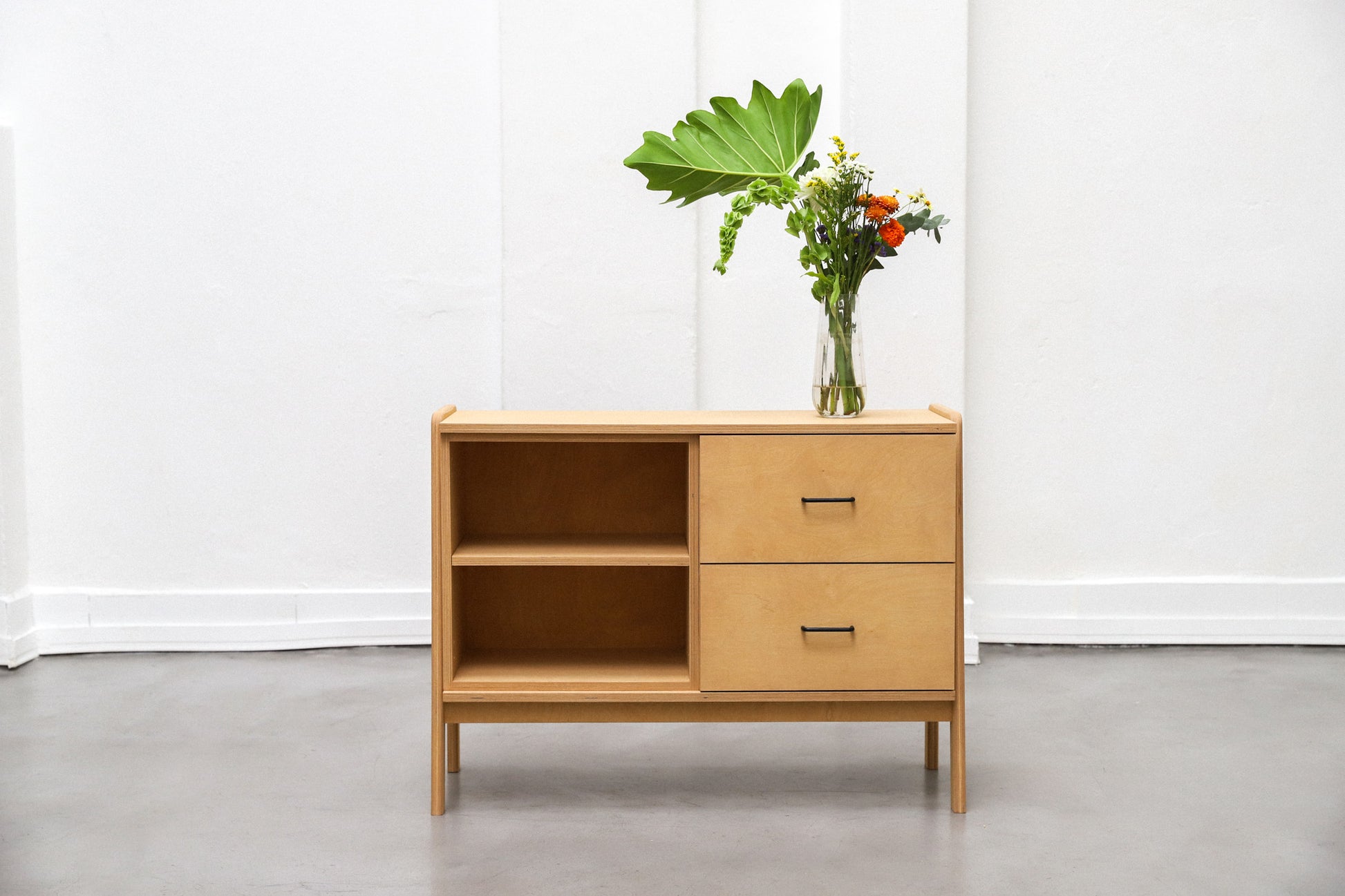 Aparador hecho 100% en multiplaca de abedul con estante abierto y dos cajones. Protegido con aceite premium con opciones disponibles en distintas tintas. Los cajones están equipados con guías telescópicas.