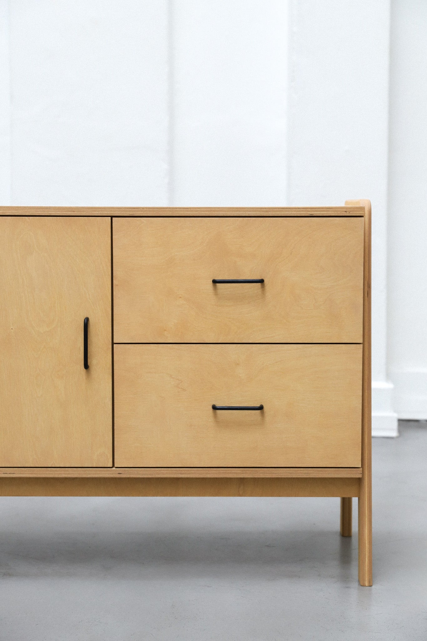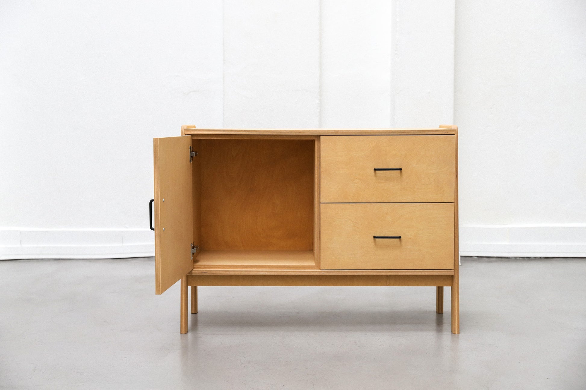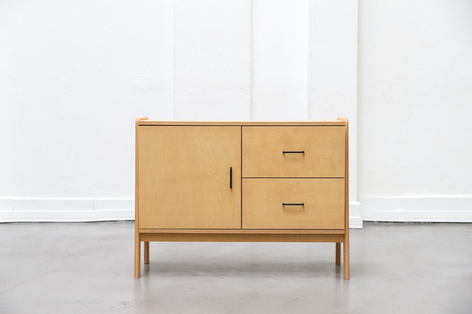 Aparador hecho 100% en multiplaca de abedul con una puerta y dos cajones. Protegido con aceite premium con opciónes en distintas tintas. Cajones equipados con guías telescópicas y puerta con bisagras de cierre suave.