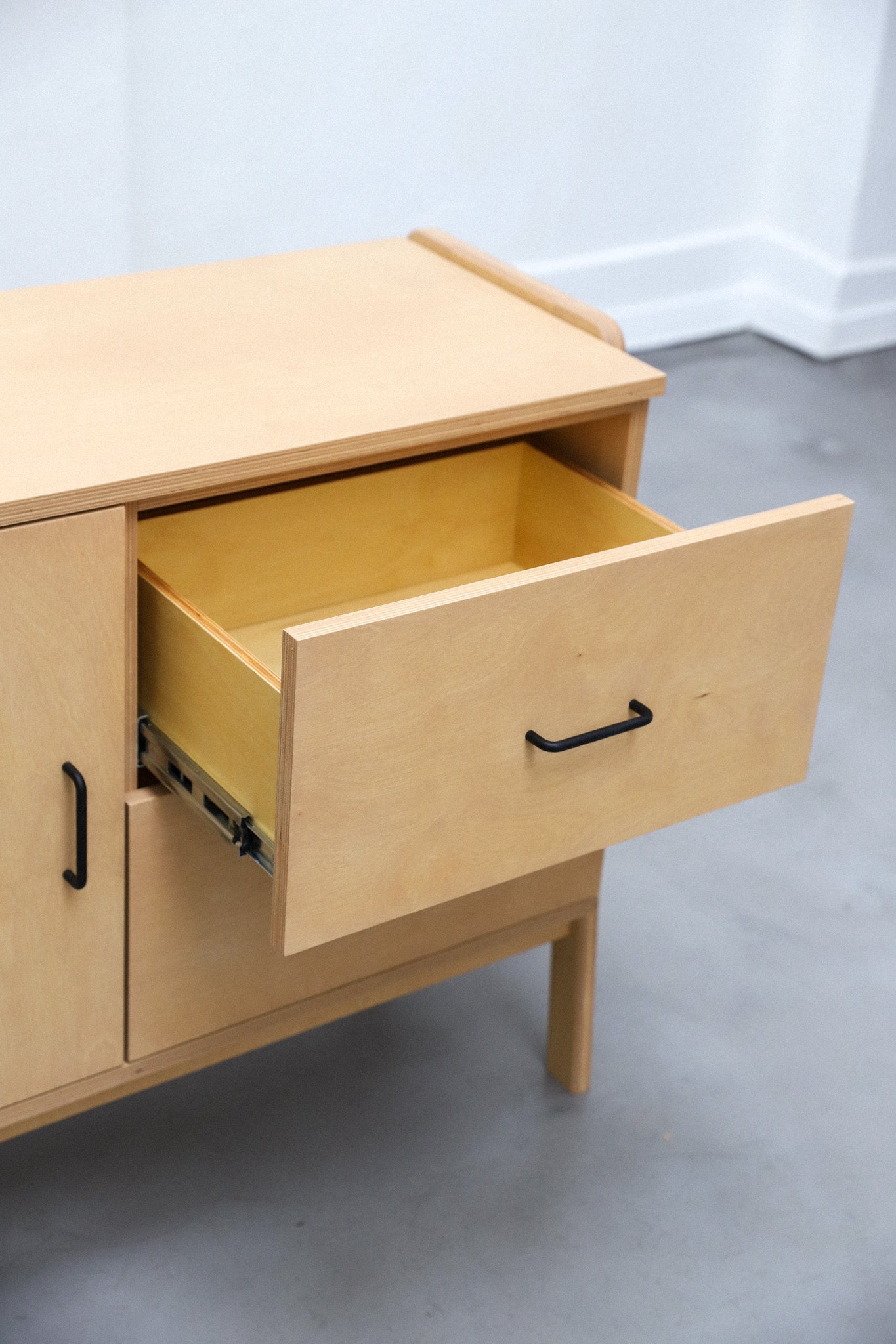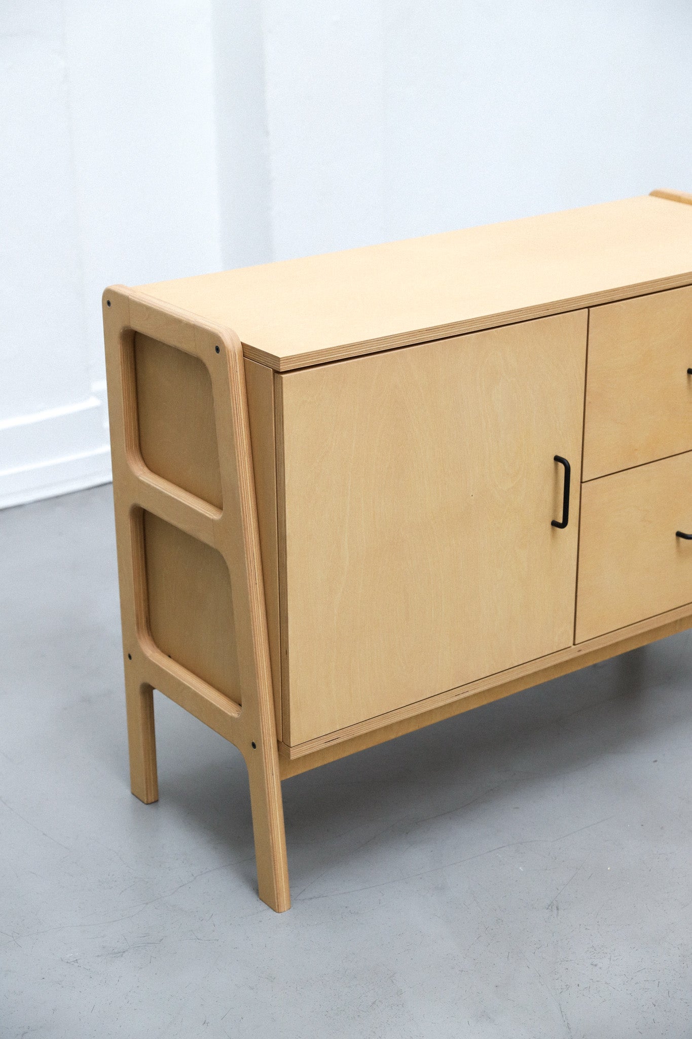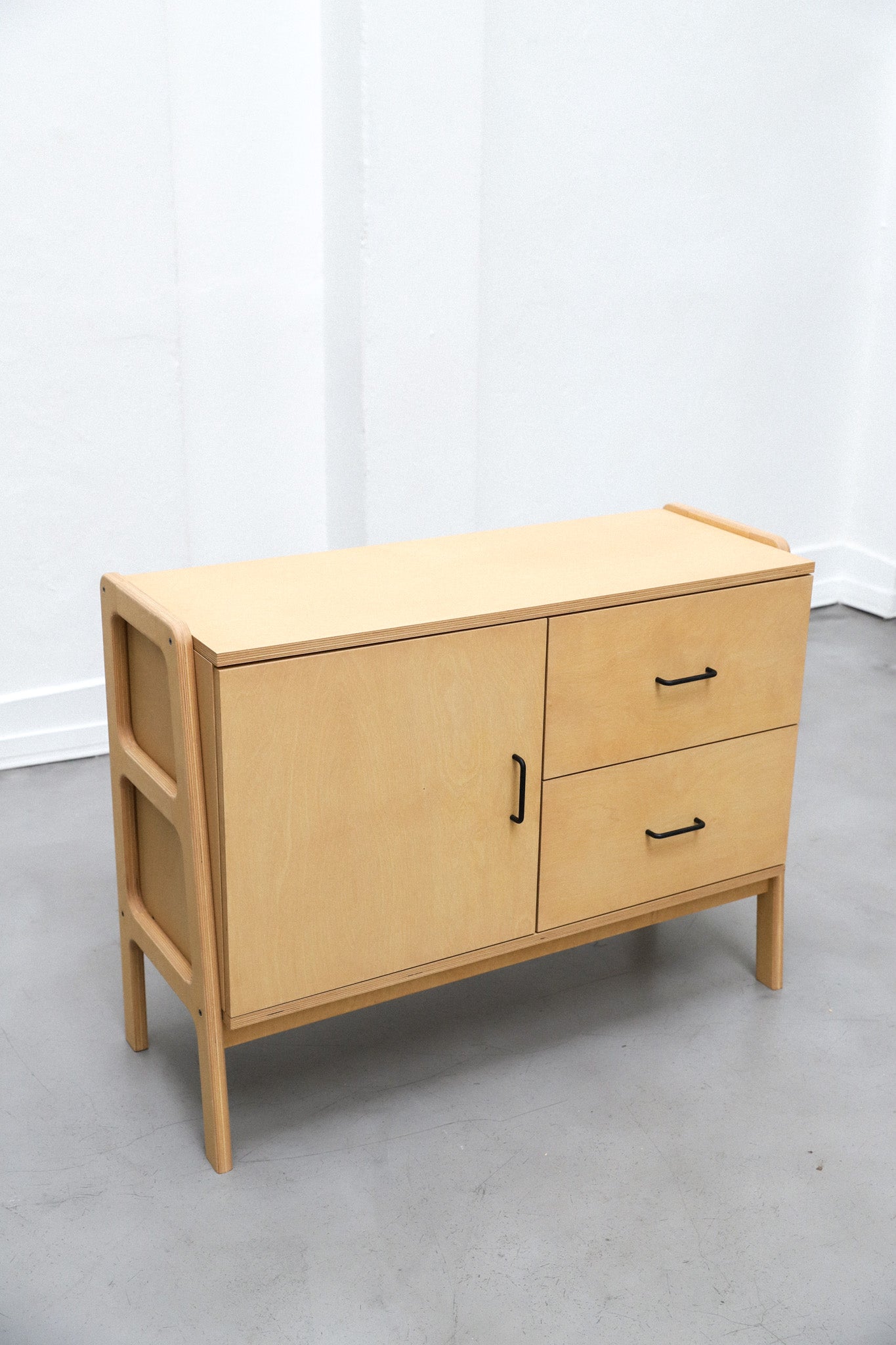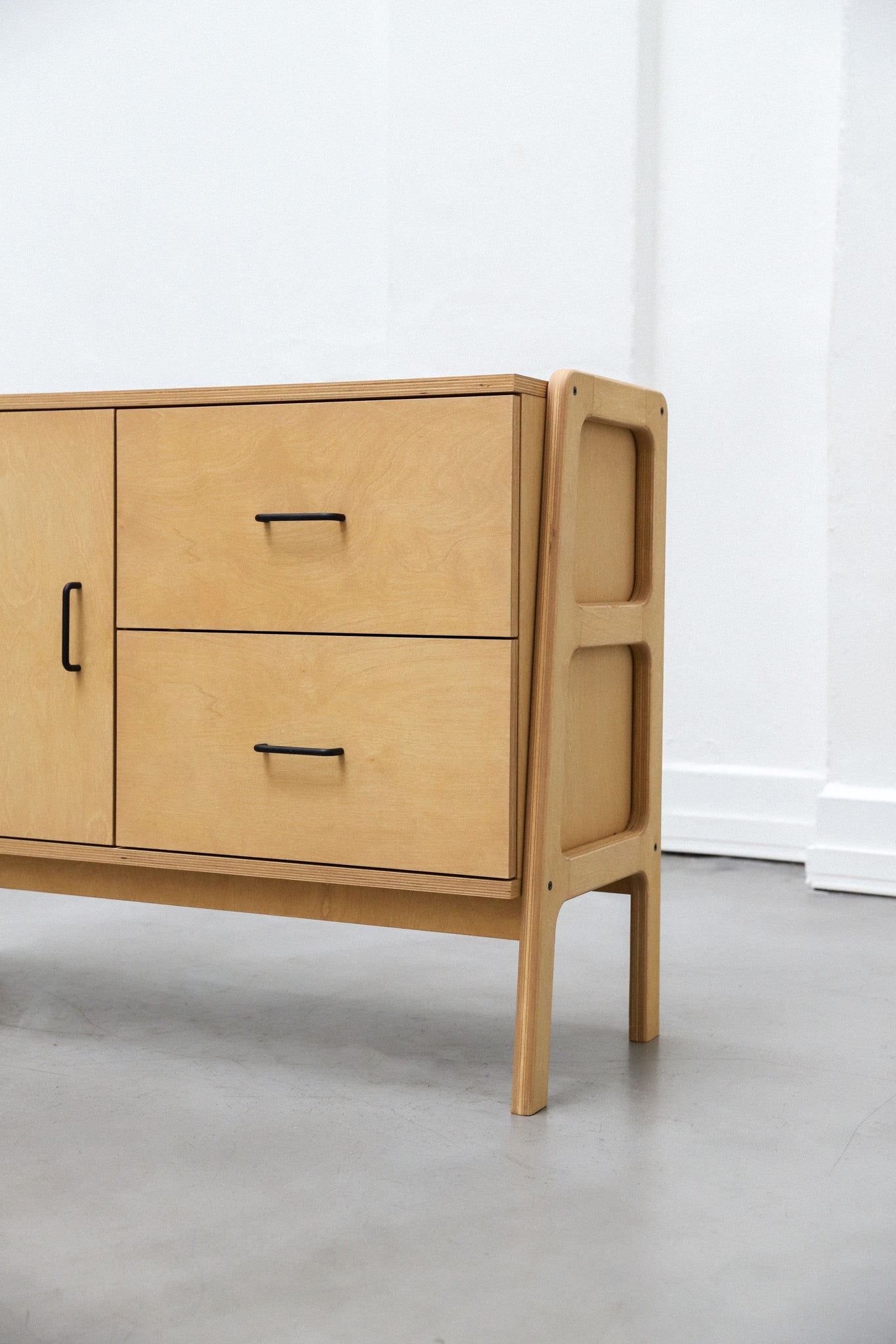 Aparador hecho 100% en multiplaca de abedul con una puerta y dos cajones. Protegido con aceite premium con opciónes en distintas tintas. Cajones equipados con guías telescópicas y puerta con bisagras de cierre suave.