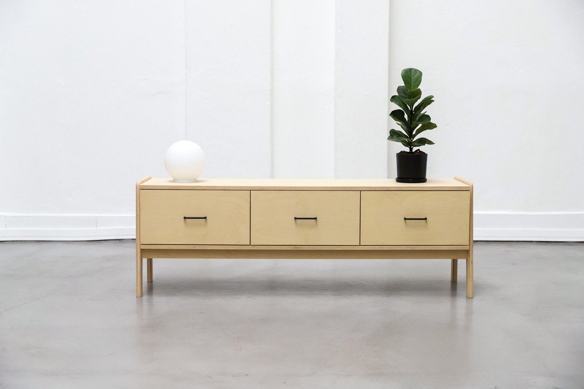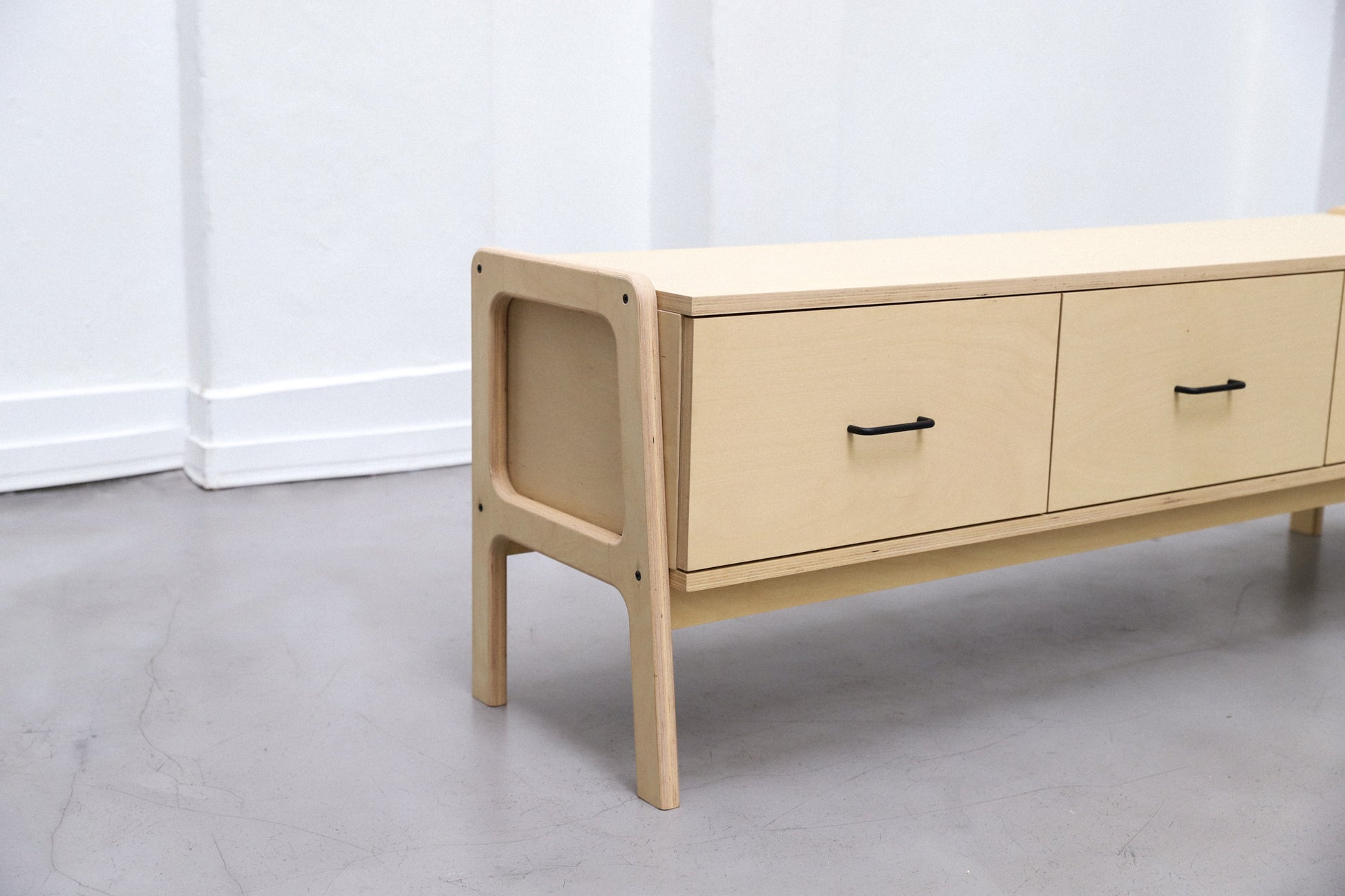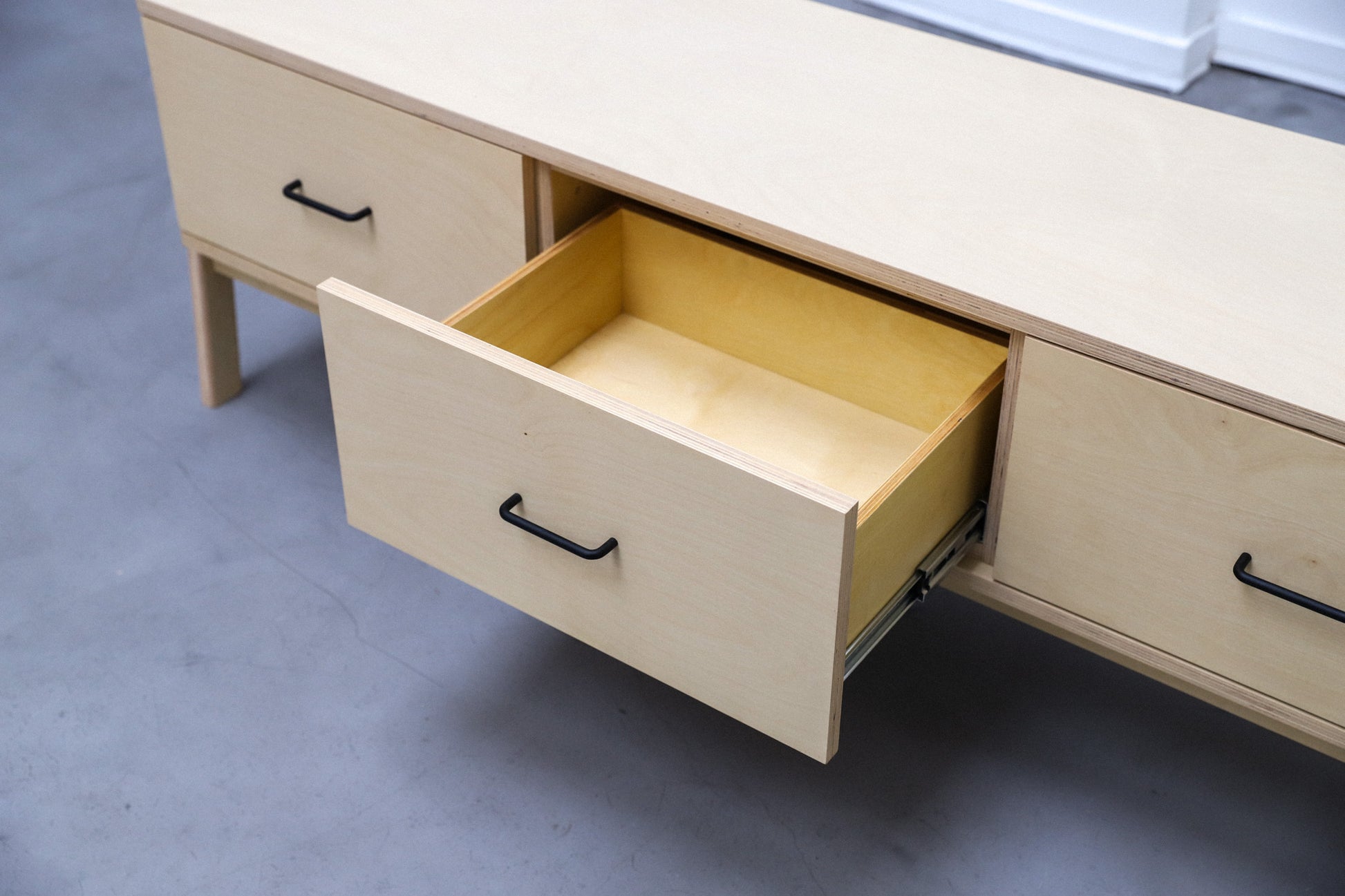 Rack de TV hecho 100% en madera de abedul y protegido con aceite premium para evitar el desgaste y lograr el mejor acabado. Cajones equipados con guías telescópicas.
