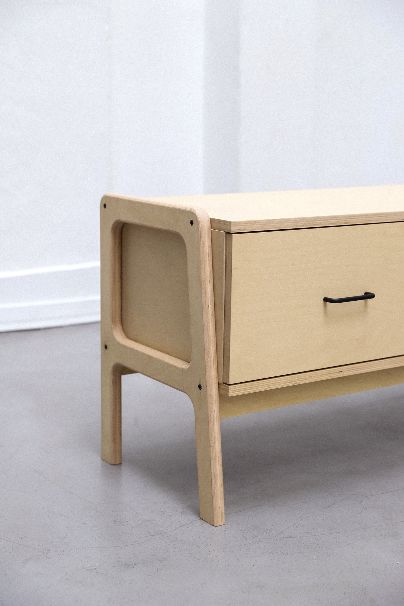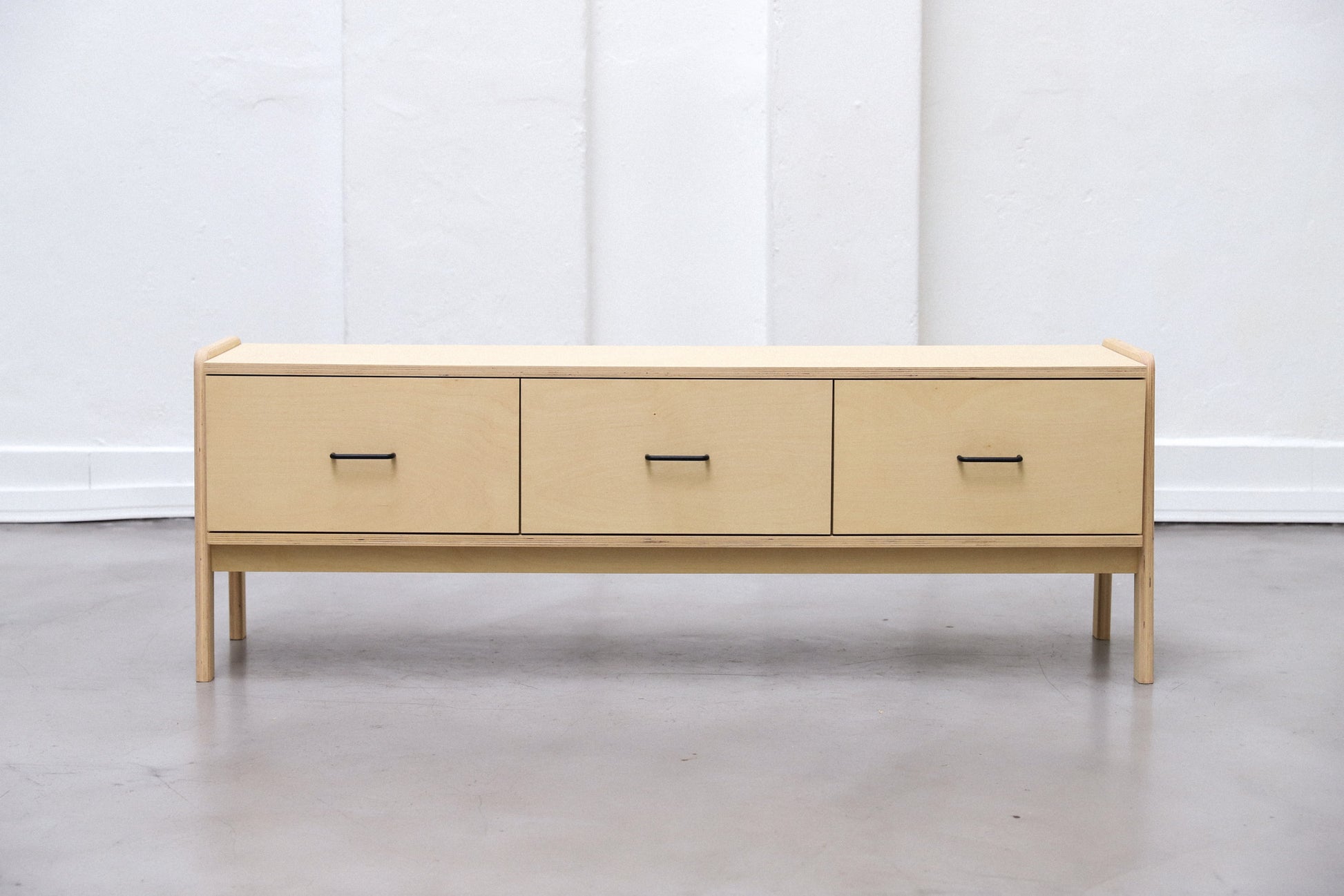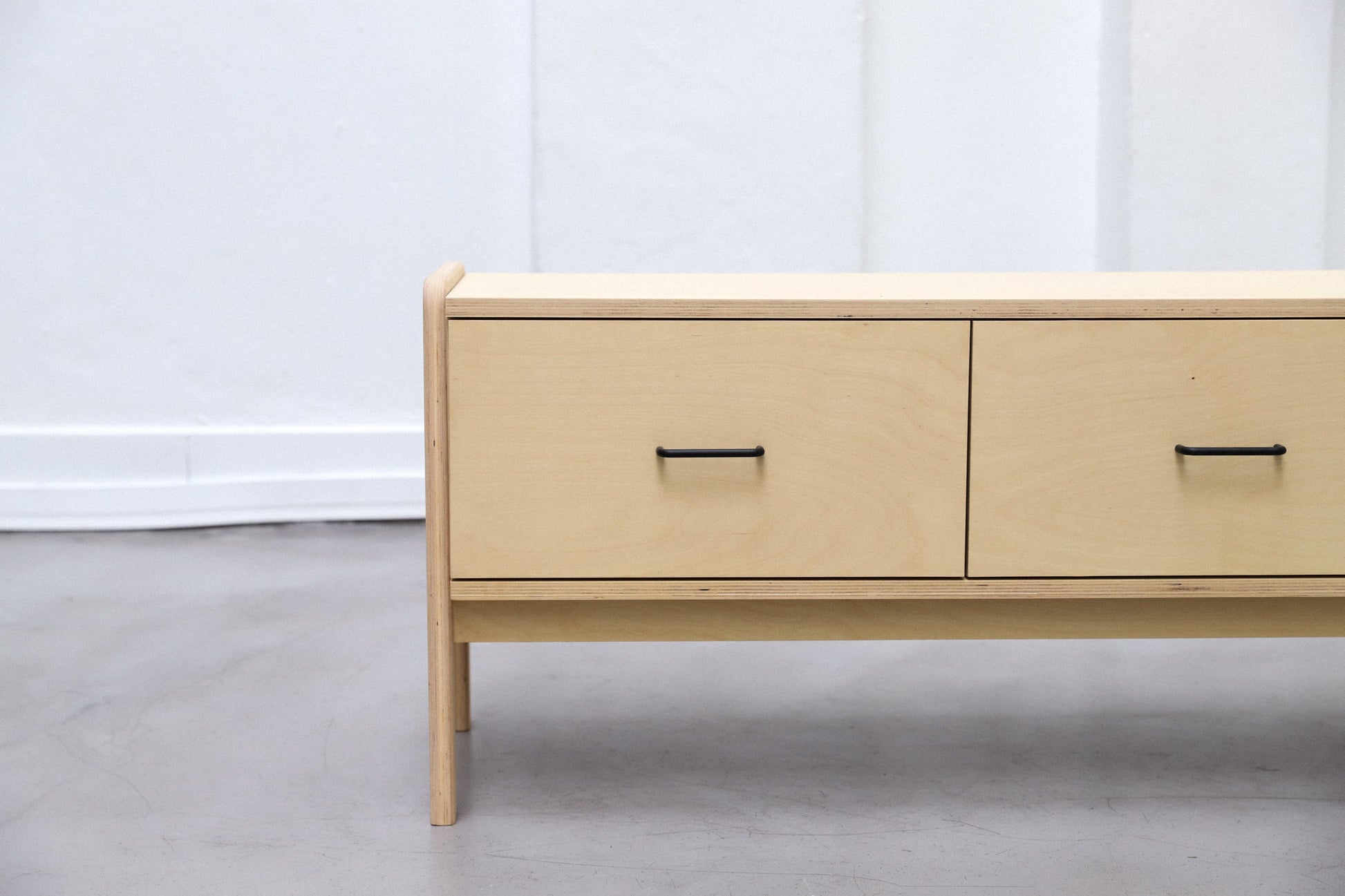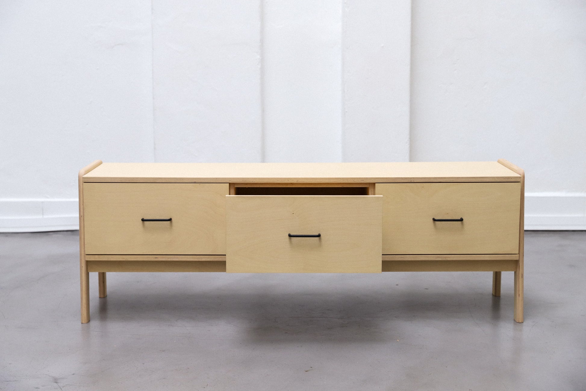Rack de TV hecho 100% en madera de abedul y protegido con aceite premium para evitar el desgaste y lograr el mejor acabado. Cajones equipados con guías telescópicas.
